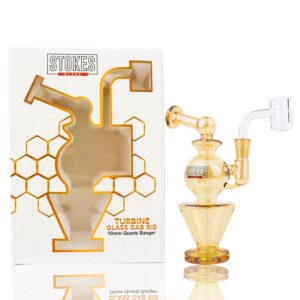 The Stokes Glass Mini Turbine dab rig “Oro Edition” showcases a fumed glass color and features a 10mm female joint with a quartz banger. Standing at 6.1 inches tall with a base width of 2.4 inches, its design encompasses a cylindrical shape, fixed feed-through stem, and a thick round base. This Stokes Glass rig design ensures a perfect and flavorful dabbing experience.